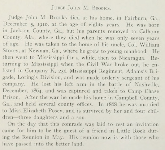" Genealogy - John M. Brooks - Elizabeth Posey - William Storey - Fairburn, Georgia - Jackson County, Georgia - Calhoun County, Alabama - Newnan, Georgia - 23d Mississippi Regiment - Nashville, Tennessee