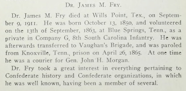 " Genealogy - James M. Fry - John Hunt Morgan - 8th South Carolina Infantry - Wills Point, Texas
