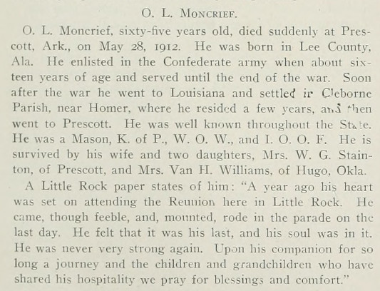 Obituary of O. L. Moncrief, Prescott, Arkansas.