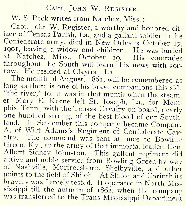 " Genealogy - John W. Register - W. S. Peck - Wirt Adam's Cavalry - 3rd Louisiana Cavalry - Bowling Green, Kentucky - Shiloh, Tennessee