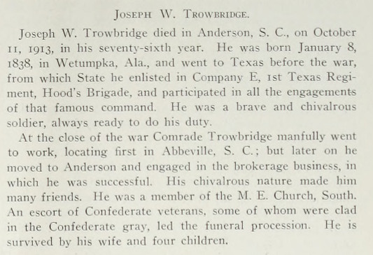Obituary of Joseph W. Trowbridge, Anderson, South Carolina.