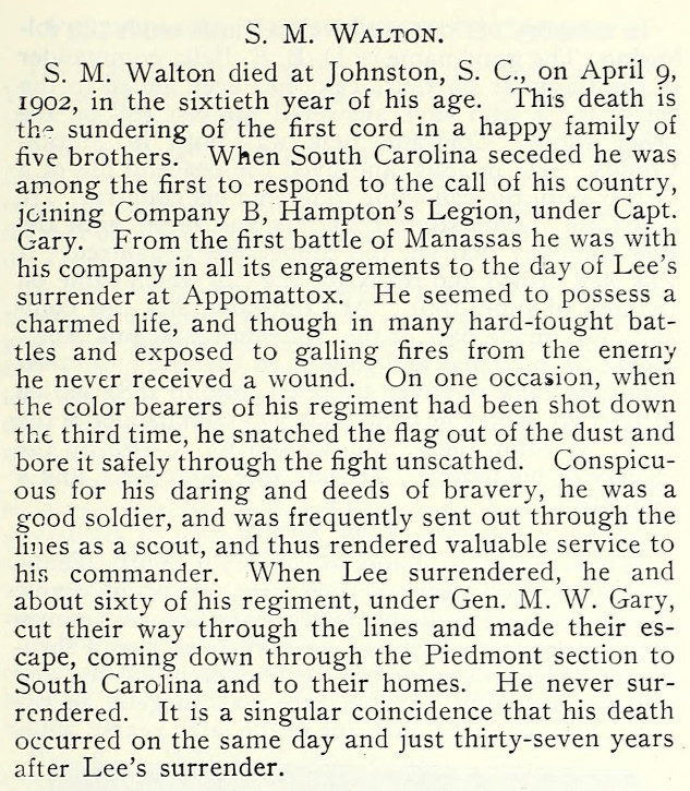 " Genealogy - S. M. Walton - M. W. Gary - Hampton's South Carolina Legion - First Manassas - Appomattox, Virginia - Johnston, South Carolina