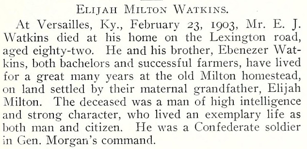 " Genealogy - Elijah Milton Watkins - Elijah Milton - Morgans Kentucky Cavalry - Versailles, Kentucky