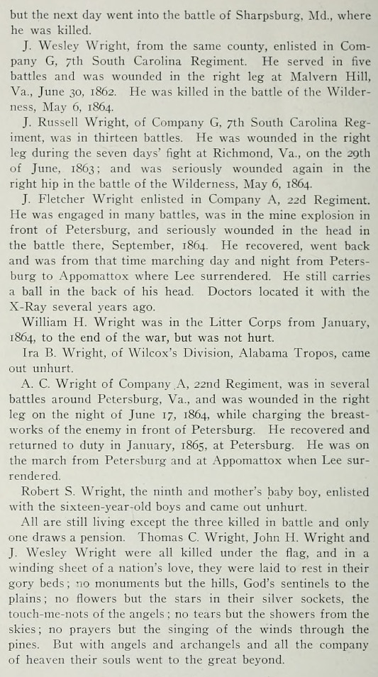 Genealogy - Jacob Wright - Thomas Wright - Joseph Wright - J. Wesley Wright - J. Russell Wright - J. Fletcher Wright - William H. Wright - Ira B. Wright - A. C. Wright - Robert S. Wright - Edgefield County, South Carolina - 7th South Carolina Regiment - 22d South Carolina Regiment